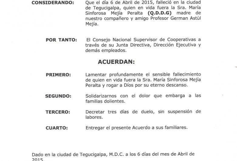 En fecha 18 de Mayo del año 2015, el Consejo Nacional Supervisor de Cooperativas CONSUCOOP, fue premiado con entrega de Pergamino por los Comisionados del Instituto de Acceso a la Información Pública (IAIP) en honor al 100% de cumplimiento...