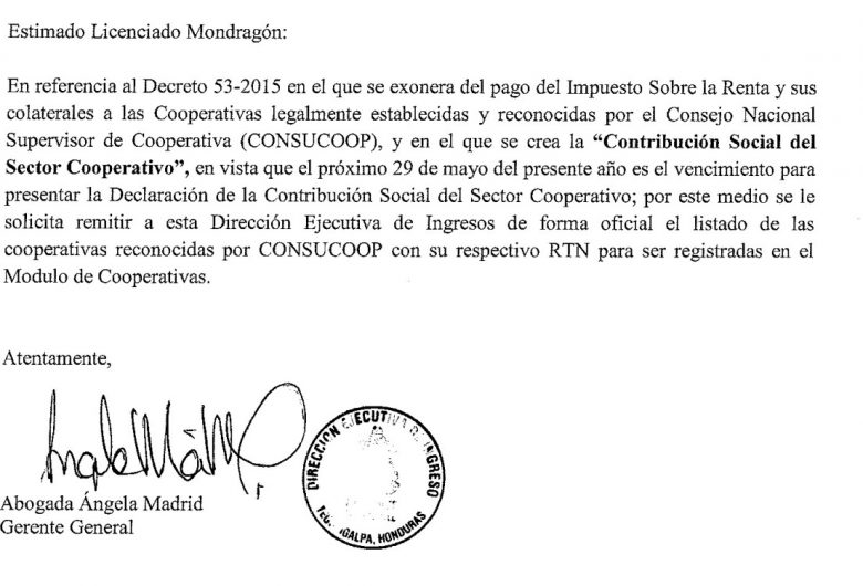 URGENTE A las Cooperativas en general, se les solicita hacer llegar su RTN y Código de Actividad Principal al siguiente correo electrónico info@consucoop.hn, con fecha limite el día Martes 19 de Mayo de 2015, esto para ser reconocidas sus...