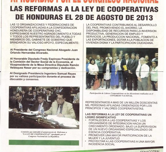 El día 28 de agosto del 2013, fueron aprobadas por el Congreso Nacional de la Republica de Honduras, las Reformas a la ley de Cooperativas de Honduras es por ellos que las doce organizaciones y Federaciones de Cooperativas afiliadas...