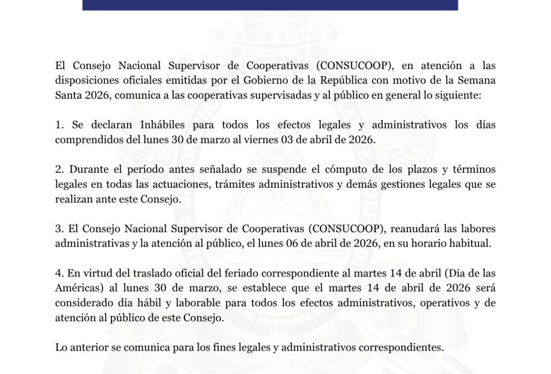 El Consejo Nacional Supervisor de Cooperativas Comunica A las Cooperativas, Federaciones, miembros y público en general: Deseamos informarles que CONSUCOOP se encuentra en proceso de traslado a nuevas instalaciones. Durante este período, solicitamos su comprensión en los trámites o...